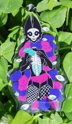 CatHeads mascot with exposed ribcage and blooming poppies surround her with eyes watching everyone's moves.