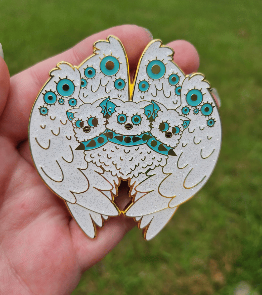 Angelic Furberus: 2.75 inches tall, white glitter, blue glow, 4 pin posts, back stamped